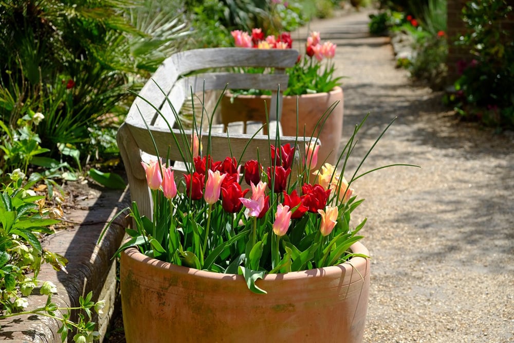 Main photo: Tulips ‘Marianne’ and ‘Atilla Graffiti’ in large clay pots, Lady Baillie Garden (Credit: Matt Jackson)
